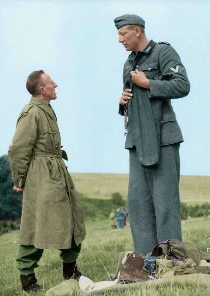 Самый высокий немецкий солдат Якоб Накен (221 см) беседует с канадским капралом Бобом Робертсом (160 см) после своей сдачи под Кале, Франция, 1944 год.