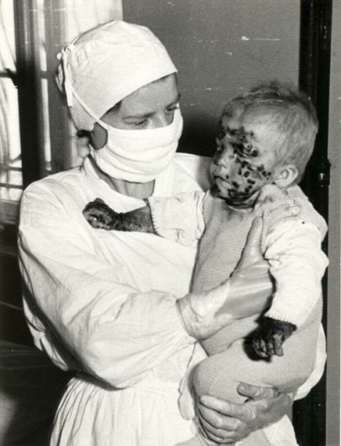 Медсестра с больным ребенком во время эпидемии оспы, Вроцлав, Польша, 1963 год.