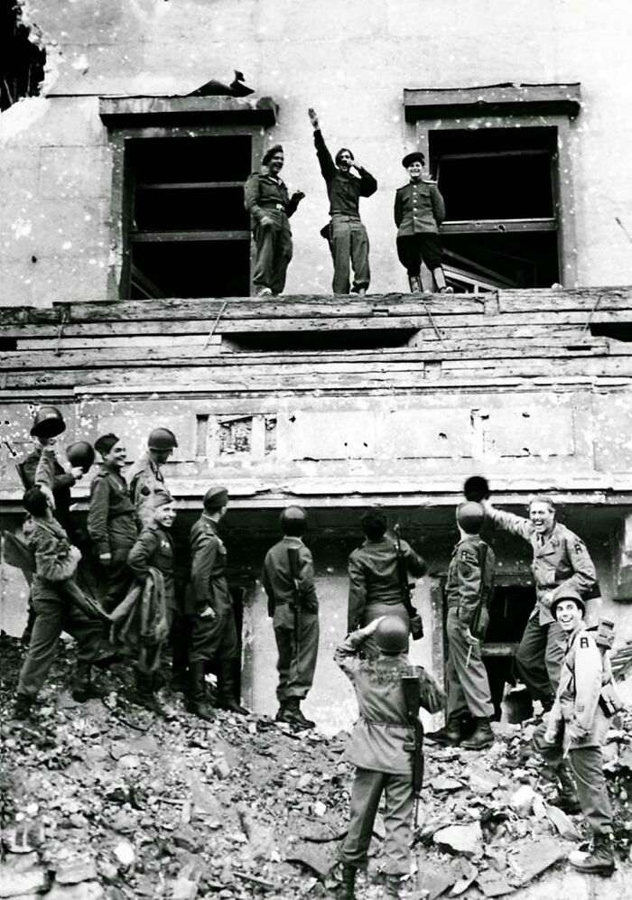 Союзные солдаты потешаются над Гитлером прямо на балконе его Рейхсканцелярии, 1945 год.