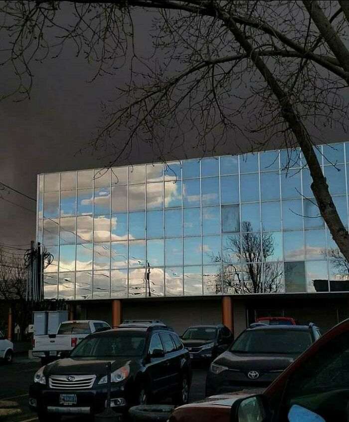 Голубое небо, отражающееся на здании, и грозовые тучи за ним
