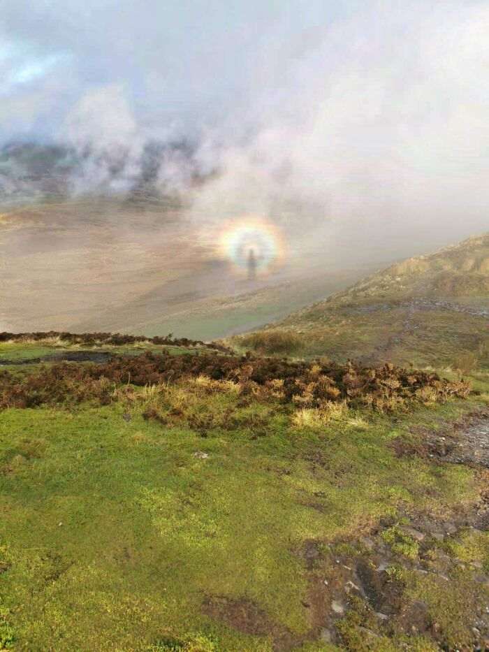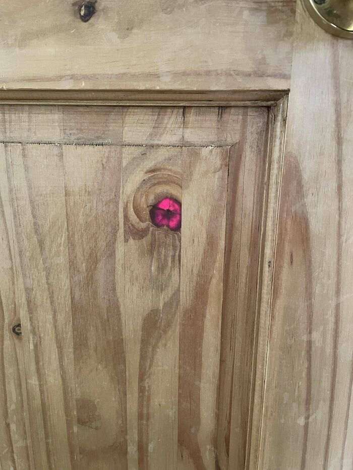 Необычный сучок на двери горит красным, когда солнце светит с другой стороны