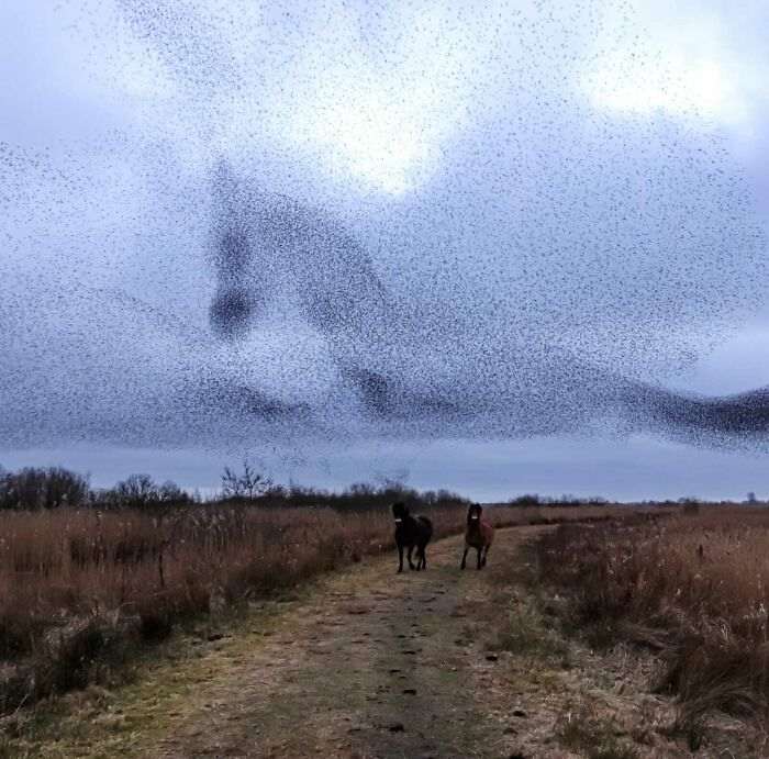 Стая воробьев, изображающих скачущую перед ними лошадь