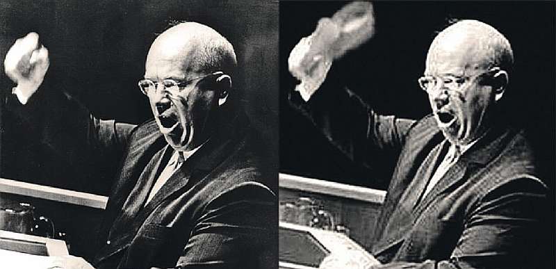 На правой фото обувь в руке прифотошопили. Нет никаких доказательств тому, что Никита Хрущев в 1960 году реально стучал ботинком по столу и кричал эти слова на заседании ООН.