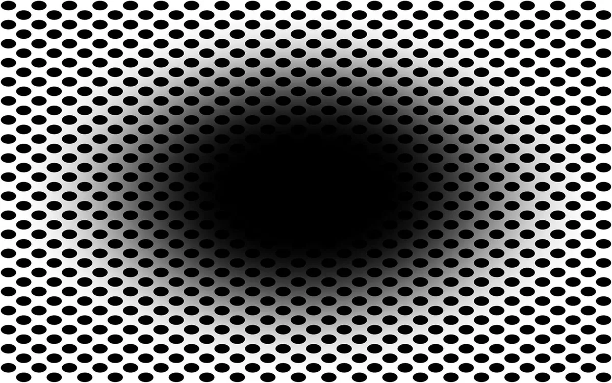 Не так уж просто поверить, что представленная выше картинка на самом деле статична. И черная дыра в окружении точек, которая будто бы расширяется в центре, совершенно точно не движется. Просто эта темная область заставляет зрачок непроизвольно расширяться, отсюда и эффект движущейся картинки.