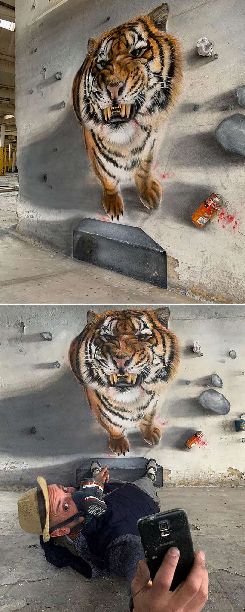 К таким произведениям можно отнести работы французского художника Пьеро Скафа. Он делает граффити в формате интерактивных 3D-иллюзий, будто бы выпрыгивающих на вас со стены. Рисунки становятся точками притяжения в местах, где поработал Пьеро: туристы и местные жители обожают фотографироваться с уникальными достопримечательностями.