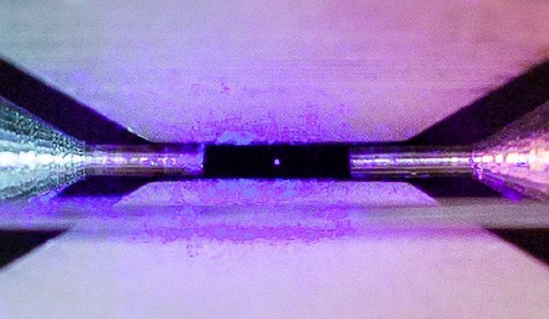 Автор фотографии – физик Дэвид Надлингер из Оксфорда. Для исторического снимка была использована вакуумная установка, удерживающая положительно заряженный атом между двух металлических игл, расстояние между которыми было всего 2 миллиметра. Чтобы частица диаметром 0.1 нанометра находилась в неподвижном состоянии, все это происходило в условиях сверхнизких температур.