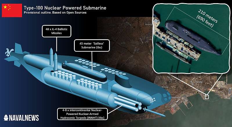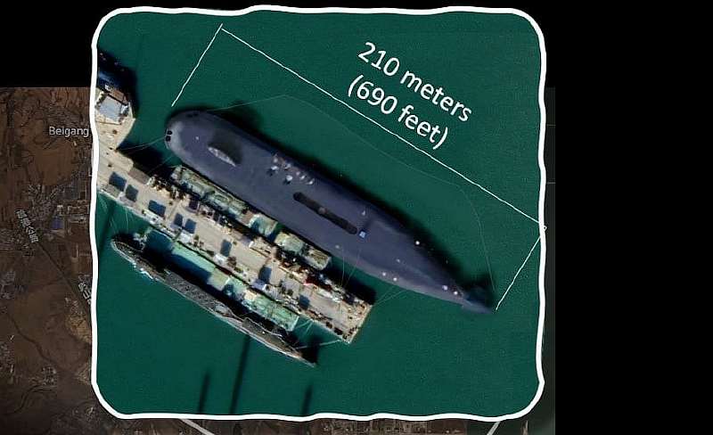 Но теперь они перестали быть самыми большими в мире. Это звание переходит к засекреченной китайской подлодке класса Тип-100 «Сунь Цзы», имеющей длину в 210 м и ширину в 30 м (против 23 м у «Акулы»). Свежие спутниковые снимки показывают, что Китай спустил гиганта на воду в Бохайском заливе.
