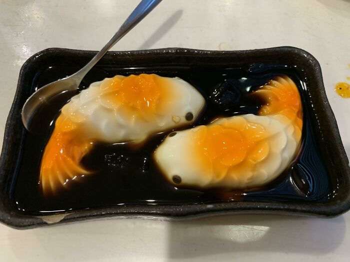 Карпы кои из кокосового желе плавают в кофейном озере