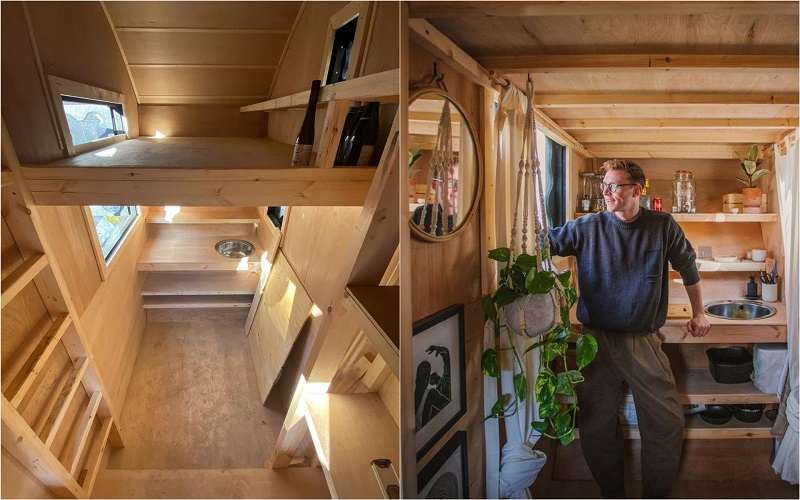 Skip House имеет стальное основание из мусорного бока и деревянную надстройку, которая помогает немного смягчить тесный интерьер. Есть кухонная зона с переносной одноконфорочной плитой, небольшой раковиной, мини-холодильник, столик, который заменяет обеденное и рабочее место, а также «чердак» с кроватью в полный рост. В домике нет туалета, и тем более душа, который Маршалл принимает на работе или в спортзале.