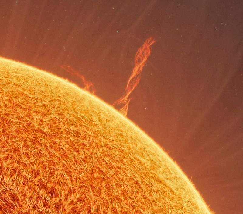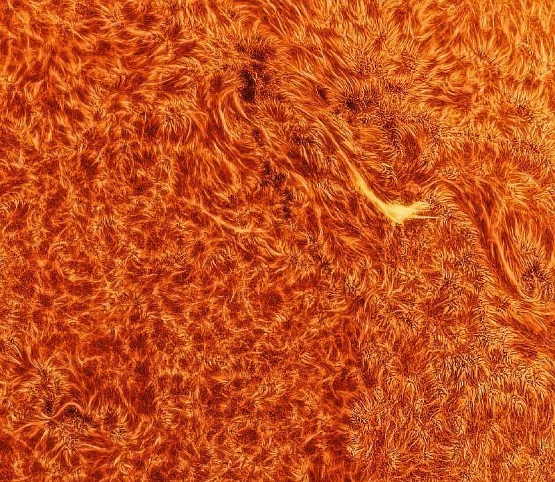 К примеру, в правой верхней части солнечного диска можно заметить вихрящийся столб пламени. Это исполинский протуберанец высотой в 120 тысяч километров, который рос на протяжении трех дней. Чтобы вы примерно представили его высоту, его можно можно сравнить с диаметром Сатурна или почти десятью диаметрами Земли.