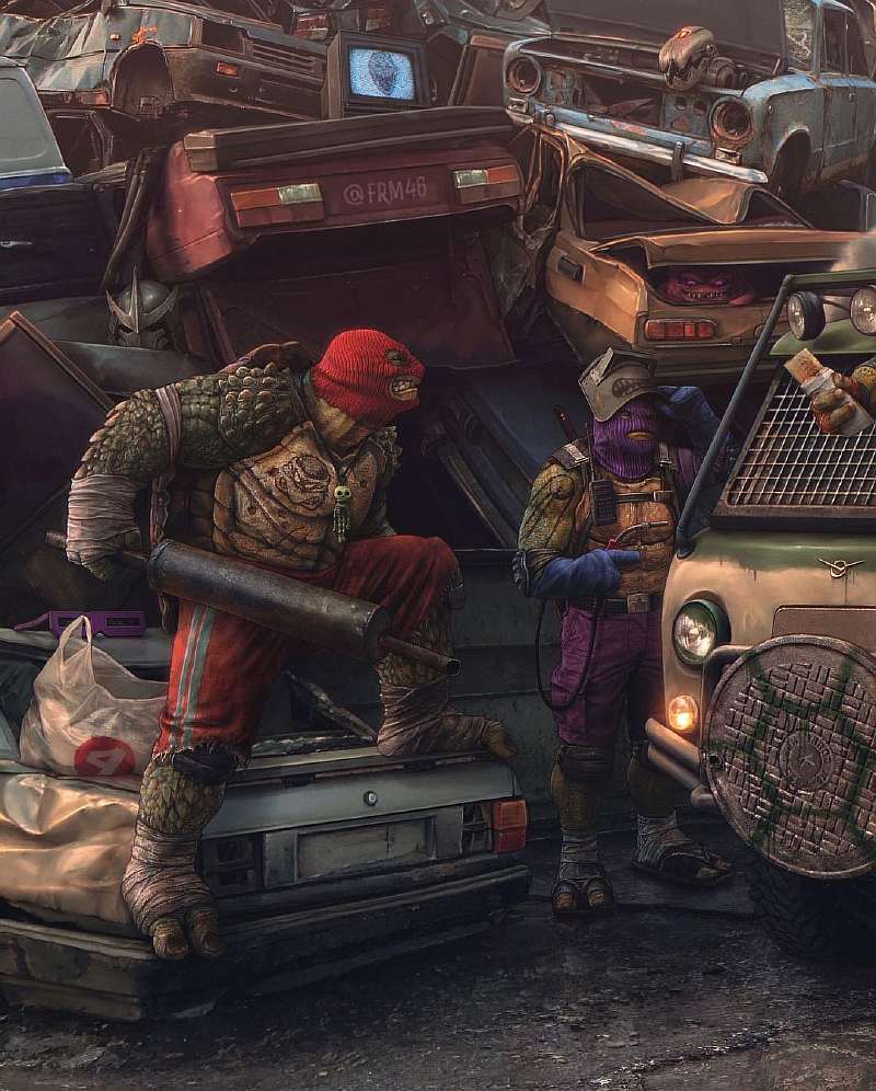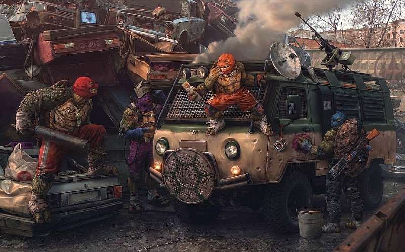 По задумке художника черепашки-мутанты ездили бы на «буханке» (УАЗ-2206), ели шаурму, а вместо нунчак, палки, катан и кинжалов-сай использовали бы подручные средства и АК-47.