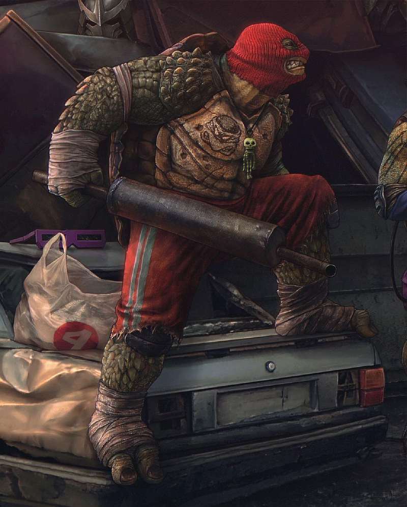 Выглядеть, кстати, черепахи тоже стали куда более сурово: из деталей можно выделить армейский ремень со «звездной» бляхой, татуировки и спортивные штаны. Ну а внимательные зрители заметят Крэнга, шлем Шреддера, отсылку к «Ну, погоди!».