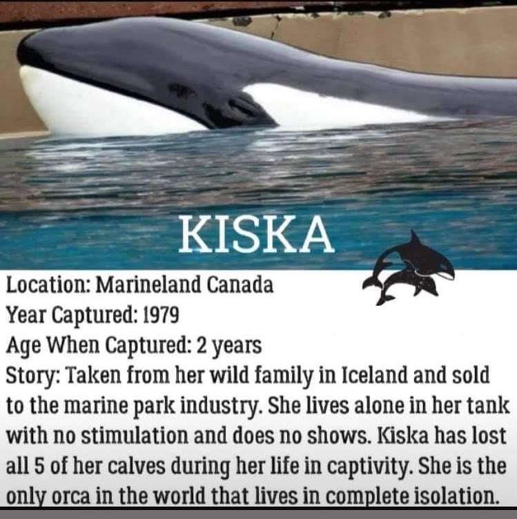 Киска была поймана в 1979 году, будучи еще детенышем, недалеко от побережья Исландии. Ей было всего три года, когда Marineland купил ее, и с тех пор косатка провела 42 года в заточении. Раньше она делила резервуар с другими китообразными. Уже в неволе она родила пятерых детей, но все они прожили недолго, и постепенно вымерли другие крупные рыбы в парке. В конце концов, Киска осталась одна…