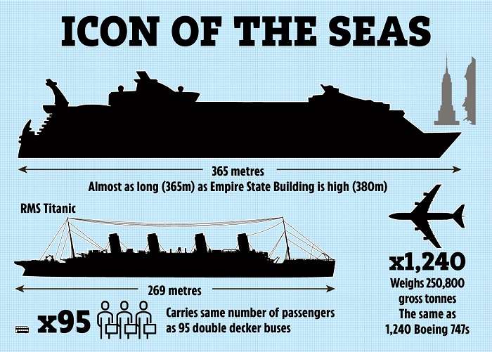 Большие корабли обычно сравнивают с «Титаником» – его длина составляла 269 метров. Так вот, длина Icon of the Seas – 365 метров, однако основное отличие заключается в тоннаже судна. По этому параметру у «Титаника» 46 329 БРТ, а у «Иконы морей» — 250 800 БРТ. Так что современный лайнер более чем в пять раз крупнее, чем легендарный рекордсмен.
