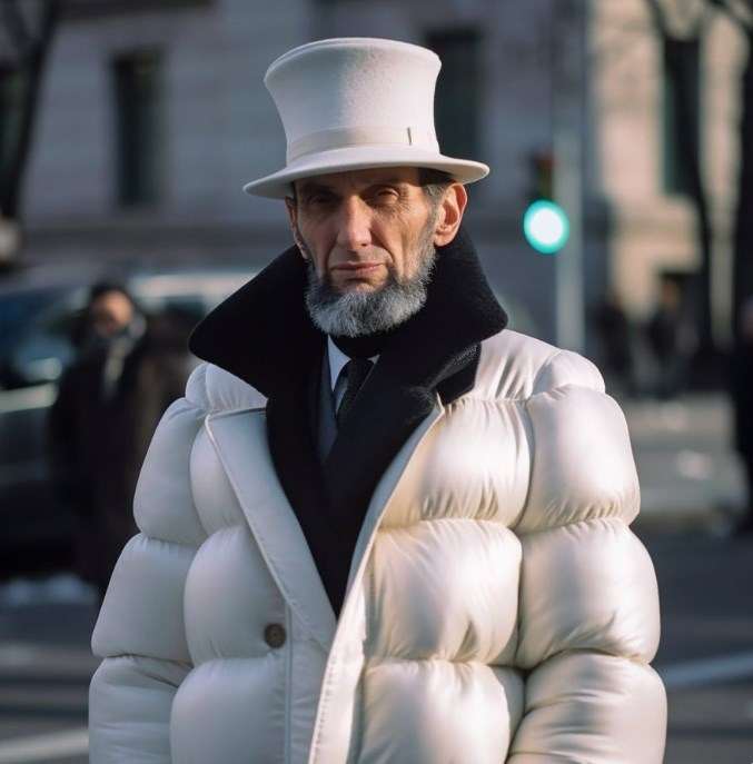 Что интересно, с помощью Midjourney в аналогичный пуховик можно «одеть» любую историческую фигуру. Например, вот так выглядит модный 16-й президент США Авраам Линкольн.