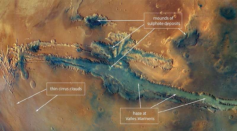 Интересны и белые пятна. Они располагаются в каньоне Valles Marineris и указывают на высокое содержание сульфатные минералы. Эти минералы – одно и свидетельств того, что на Марсе были океаны, которые выветривалась в более кислых условиях, чем в регионах с глинистыми отложениями. Но к жизни планета была недружелюбна даже при наличии воды.