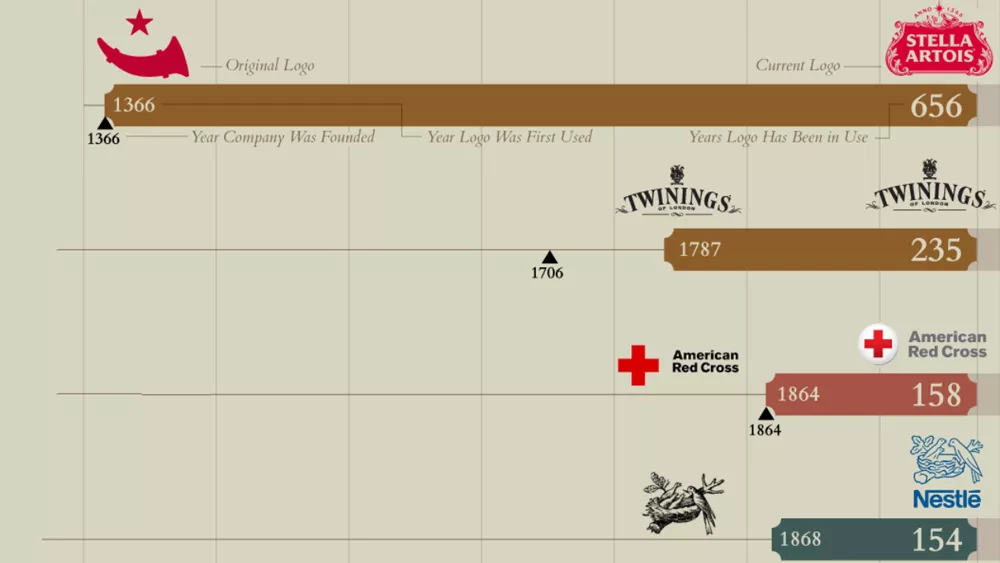Большинство логотипов принадлежат компаниям, производящим продукты питания и напитки. Самый старый логотип имеет бельгийский пивной бренд Stella Artois. Его датируют 1366 годом, следовательно, изображению уже 656 лет. Первоначальный логотип представлял собой минималистичный рог со звездой наверху. В наши дни его доработали, но лого по-прежнему включает эти элементы.