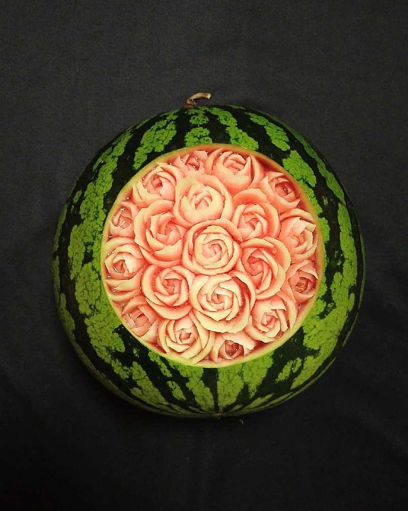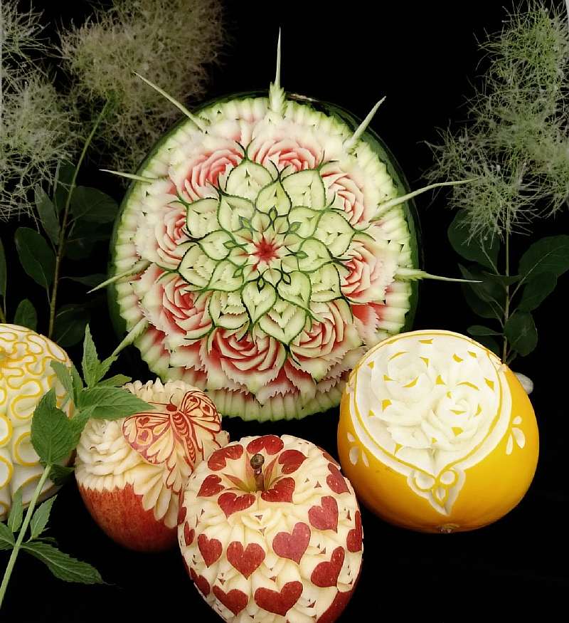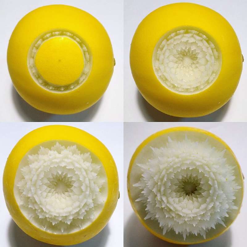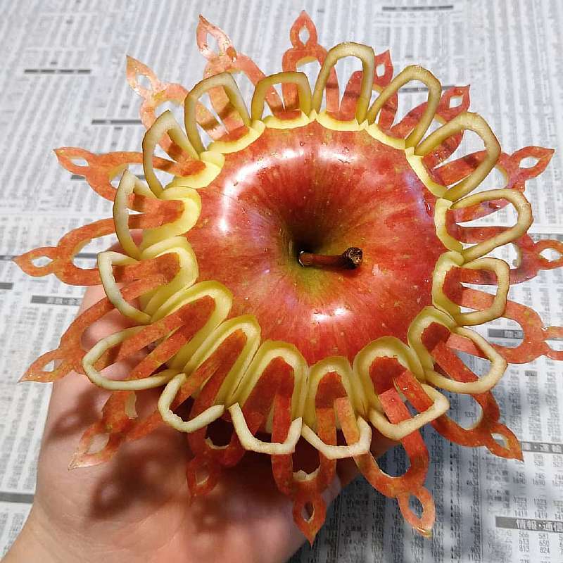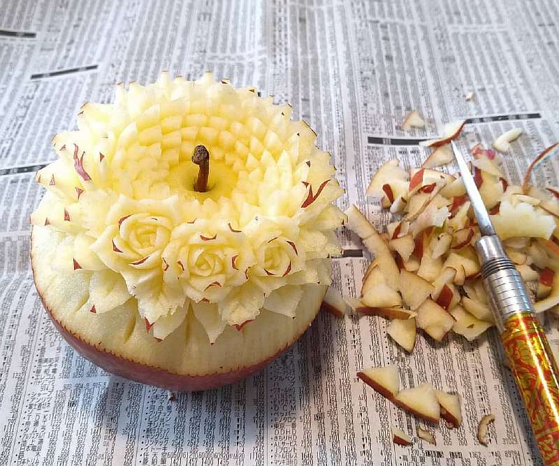 В резьбе по фруктам и овощам сложность заключается не только в том, что нужно делать очень мелкие узоры с ювелирной точностью, но еще и в том, что все должно происходить очень быстро. «Материалы» для творчества — например, яблоки — стремительно теряют первоначальную красоту, если повредить их кожуру. Поэтому у Гаку есть всего несколько минут, чтобы закончить очередную красоту, а затем еще и сфотографировать результат.