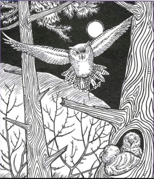 - кисточка, змея, иголка и ложка — на стволах дерева;