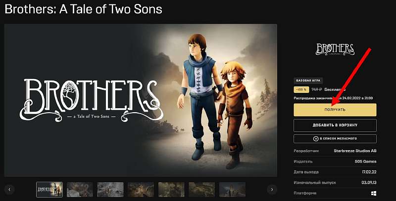 Раздача Brothers: A Tale of Two Sons уже началась. Чтобы добавить игру на свой аккаунт, достаточно зарегистрироваться в EGS, перейти по этой ссылке и нажать «получить». Акция продлится до 24 февраля, после чего бесплатно будут отдавать ролевую инди-игру Cris Tales.