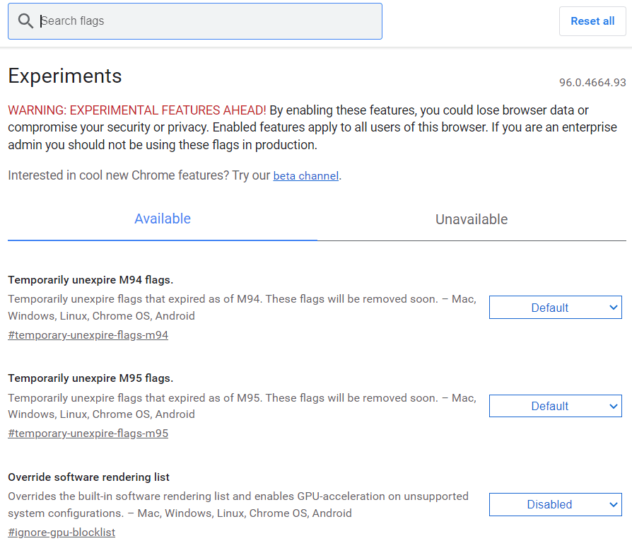 Полный список «флагов» очень длинный, и не все из них реально полезны. Рассмотрим самые нужные из того, что доступно на середину декабря 2021.
