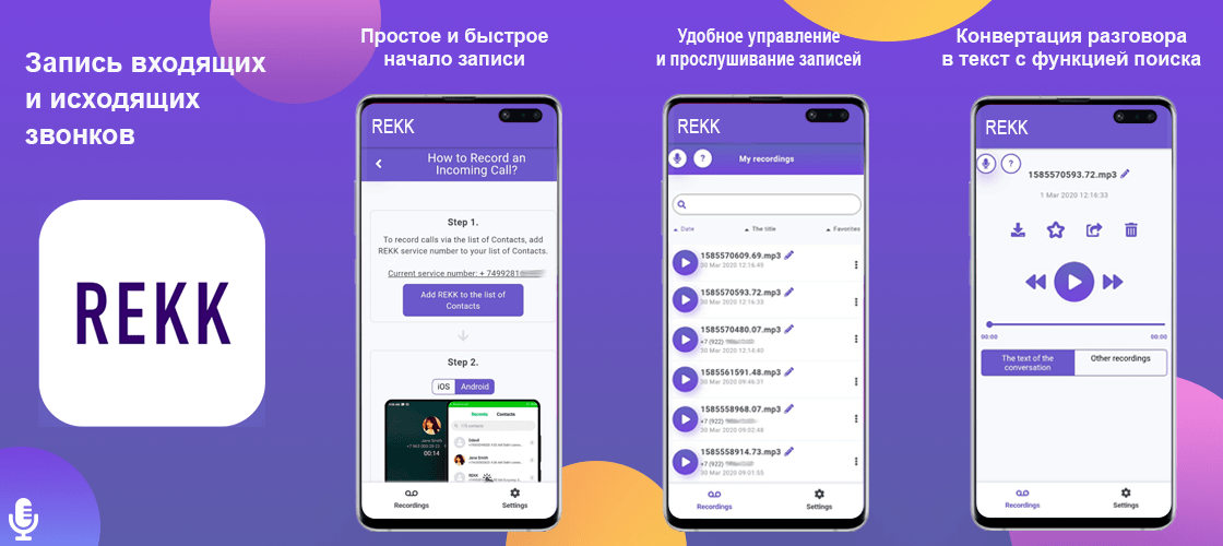 REKK — единственное приложение из списка, поддерживающее все версии Android, начиная с 5, и предоставляющее удаленный доступ к записанным разговорам с любого устройства. Многие рекордеры из Play Маркет перестали поддерживать 10 версию Android, однако REKK никогда не столкнется с такой проблемой, так как приложение использует единственный надежный способ записи звонков — создание конференции с сервисным номером. Запись через объединение звонков не привычна многим пользователям этой операционной системы, но она дает 100% гарантию записи телефонного разговора. Это огромное преимущество перед другими решениями для записи звонков, так как такое приложение не подведет пользователя в самый важный момент.