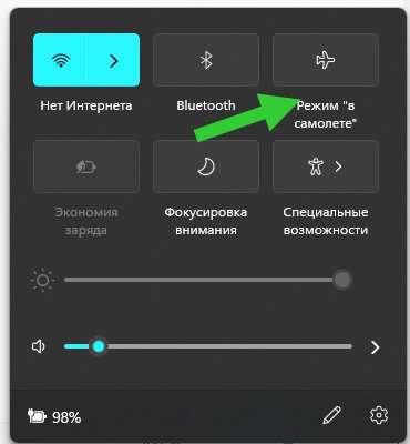 То же самое легко делается на ноутбуках и планшетах с Windows — кликните по символу Wi-Fi в правом нижнем углу, и вы увидите переключатель «Режим в самолете».