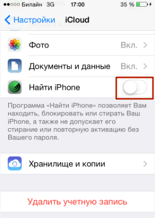 - Пролистнув вниз, найдите переключатель напротив Найти iPhone и сдвиньте его в активное положение.