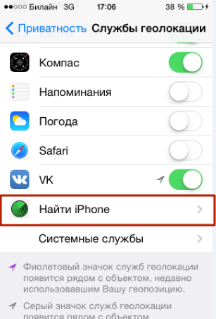 - Далее необходимо вернуться в главное меню настроек и перейти по следующему пути: Приватность — Службы геолокации — Найти iPhone. Открыв последнее, вы увидите ползунок, который необходимо переключить в активное положение.