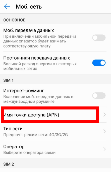 - Затем — “Точка доступа” или “Имя точки доступа (APN)”.