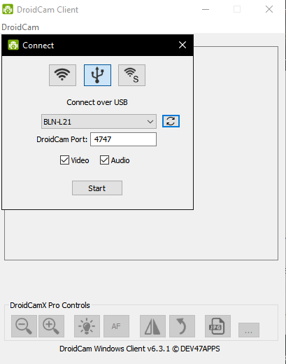 - Запустите DroidCam на телефоне и ПК. На последнем кликните по иконке с изображением USB.