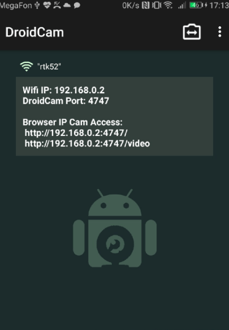 - После установки откройте программу на смартфоне. На главном экране вы увидите IP адрес вашего WI-Fi, порт виртуальной камеры, а также ссылки для доступа к ней через браузер.