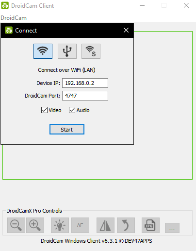- Теперь откройте программу на ПК и в строчку Device IP введите цифры, указанные на смартфоне в строке Wi-Fi IP. Внизу есть два поля: Video и Audio. По умолчанию галочка стоит только возле первого. Если вам нужно, чтобы со смартфона захватывался и звук — поставьте галочку и во втором поле.