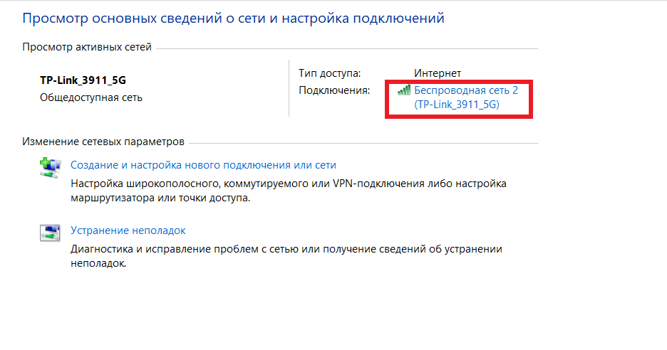 - Вне зависимости от способа, которым вы зашли в центр управления сетями, дальше действуем по одной схеме. Ищем название нужного Wi-Fi в подразделе «Просмотр активных сетей» и щелкаем по надписи справа.