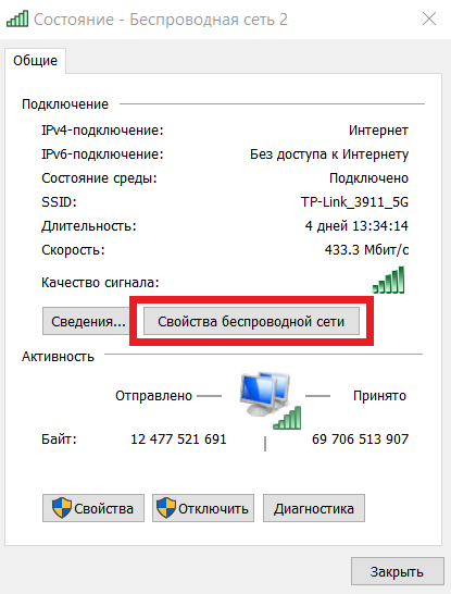 - Откроются настройки выбранного Wi-Fi. Щелкаем по плашке «Свойства беспроводной сети».