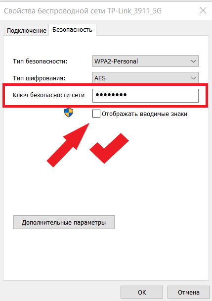 - Переходим в раздел «Безопасность». Там вы увидите графу «Ключ безопасности сети», где и содержится пароль от вашего Wi-Fi. По умолчанию он скрыт точками, но от них легко избавиться — просто поставьте галочку «Отображать вводимые знаки» снизу.