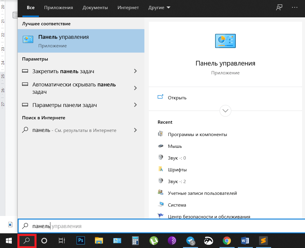 - Открываем «Панель управления». Проще всего ее найти, воспользовавшись поиском в меню «Пуск».
