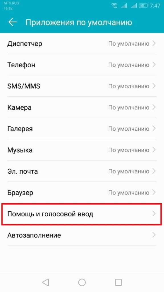- В разделе «Приложения по умолчанию» найдите вкладку «Помощь и голосовой ввод».