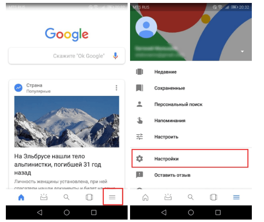 - Запустите приложение Google, перейдите в самую правую вкладку и в меню выберите «Настройки».