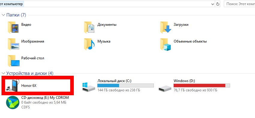 - Зайдите в “Мой компьютер” и найдите там появившуюся папку мобильного устройства.