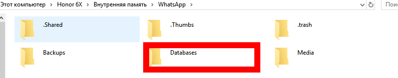 - Перейдите по уже знакомому пути WhatsApp > Databases. Поскольку вы заранее установили приложение, последняя папка должны существовать. В противном случае создайте ее самостоятельно.