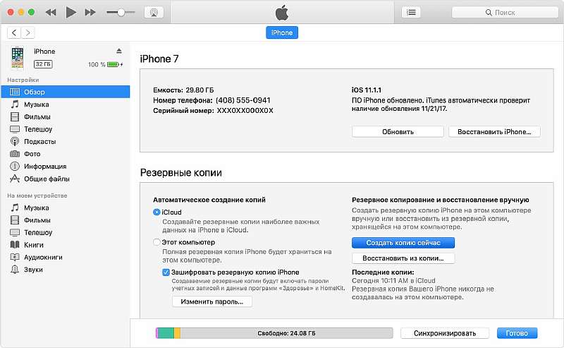 - Создайте резервную копию, нажав на кнопку «Создать копию сейчас» в пункте «Обзор» настроек устройства в iTunes.