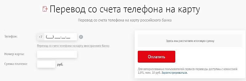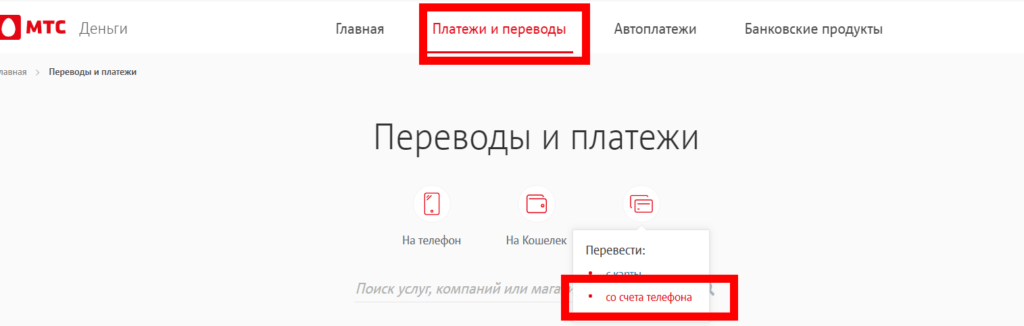 - “Платежи и переводы” — “На карту со счета телефона”.