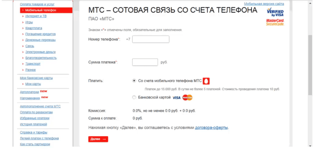 - Вы увидите поля с номером телефона и суммой трансфера, введите в них нужные данные, после чего нажмите “Далее”.