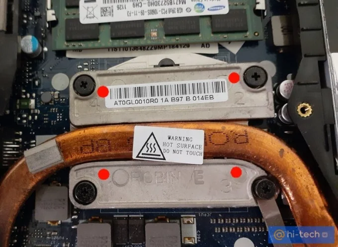 Шаг 4. Отключаем радиатор. Ослабляем подпружиненные винты, которые держат трубку радиатора на процессоре и видеокарте. Обратите внимание на нумерацию рядом с винтами — ослабляем в правильном порядке (обычно от центра к краям). Снимаем винты.