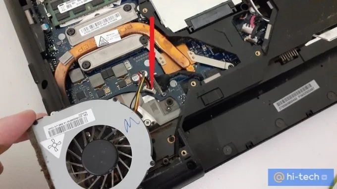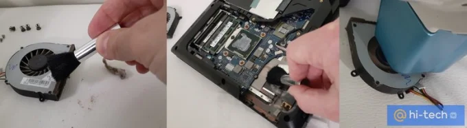 Шаг 5. Снимаем кулер. Откручиваем винты, удерживающие вентилятор. Аккуратно отсоединяем шлейф питания кулера (обычно маленькая колодка — поддеваем пинцетом).