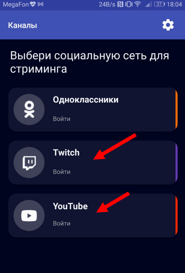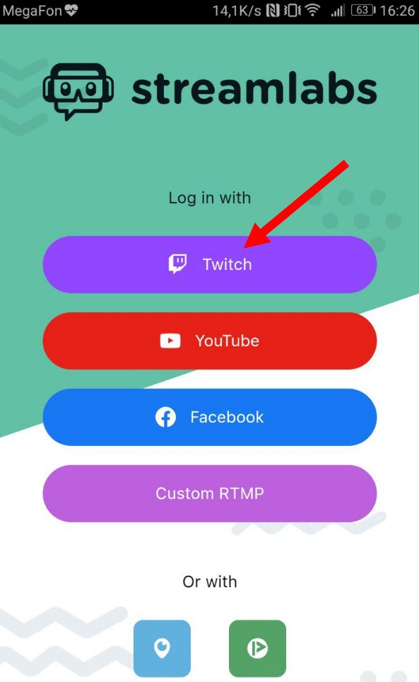 - На экране входа вам предложат выбрать сервис, куда будет вестись трансляция. Выбираем первый – Twitch, вводим логин и пароль и даем все нужные разрешения.