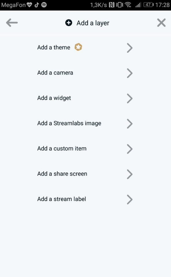 Коротко расскажем о каждом – Add a Camera добавляет на стрим изображение с камеры смартфона. Это основной слой, который вам нужно включить.