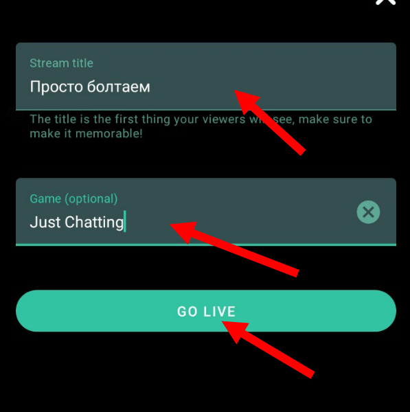 - Перед вами появится окно, где нужно указать название стрима и категорию. В первом случае вы ограничены только своей фантазией – можете написать что-то по типу “Лампово общаемся” или “Играем в …” По категории нужно выставить раздел Just Chatting. Учтите, что, если вы будете стримить с телефона под неправильной категорией, вас могут забанить.