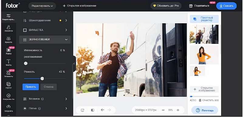 Fotor предполагает 2 варианта устранения блюра: простую настройку резкости и повышение четкости снимка. Первый вариант находится во вкладке «Зернистость», а второй можно найти в «Основной регулировке». Допустимо применить один инструмент или совместить.